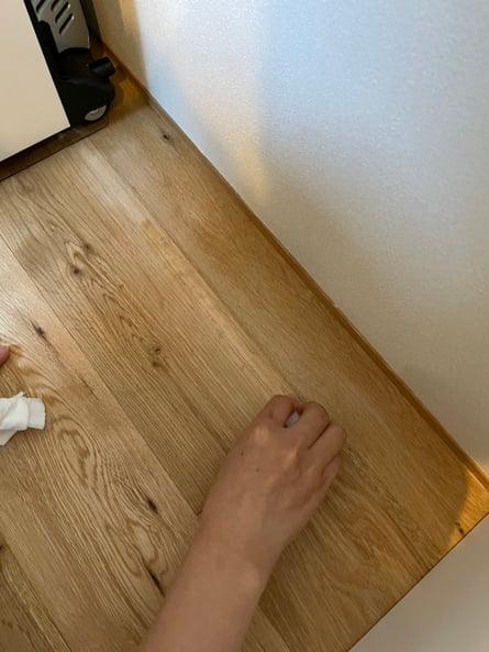写真「5.補修後」をご覧ください。どうでしょうか?割と綺麗になったと思います。床材は目線から遠くなるため、少し横着な意見ですが、完全に補修をしなくても目立ちづらいです。「完全補修」ではなく「木目に馴染ませる」事がいちばん大切です。
