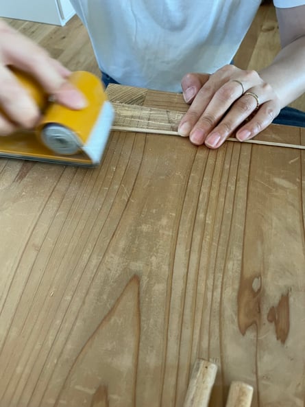 写真「2.サンディング中」をご覧ください。120番のヤスリを使用して、木目に沿って行っています。ポイントは、輪染みの箇所だけをヤスるのではなくて、輪染みがあるピース全体をヤスる事です。輪染みの部分だけをヤスってしまっては、そこだけが色が極端に変わってしまい、不自然になります。木材のピース毎であれば、多少色が違っていても不自然な感じはありません。